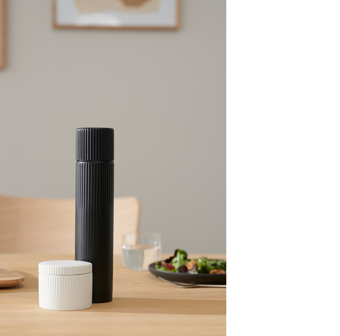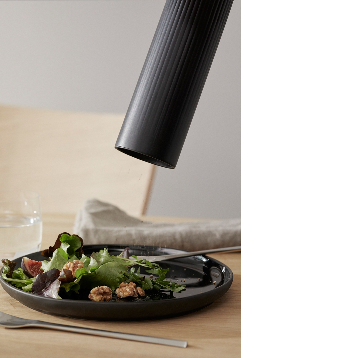 Freshly-ground pepper and salt are the icing on the cake for most meals, and with the Pleat pepper grinder and salt cellar, you can easily dispense just the right amount. The pair form a decorative element by the stove, and a tasteful supplement for any dinnerware. Pleat got its name from the streamlined grooves that run from top to bottom, providing a stylish expression and a solid grip. The simplicity, the timelessness and the strength of cylindrical shapes is what inspired us to create this modern interpretation of the classic pepper grinder and salt cellar. The steel pepper mill has a ceramic grinder, which means that it is particularly durable and can withstand everyday use for many years to come. It is also easy to fill and can be set for course grinding or fine grinding as needed. The salt cellar is made of ceramics, and the lid will keep the salt clean until you need to use a pinch.