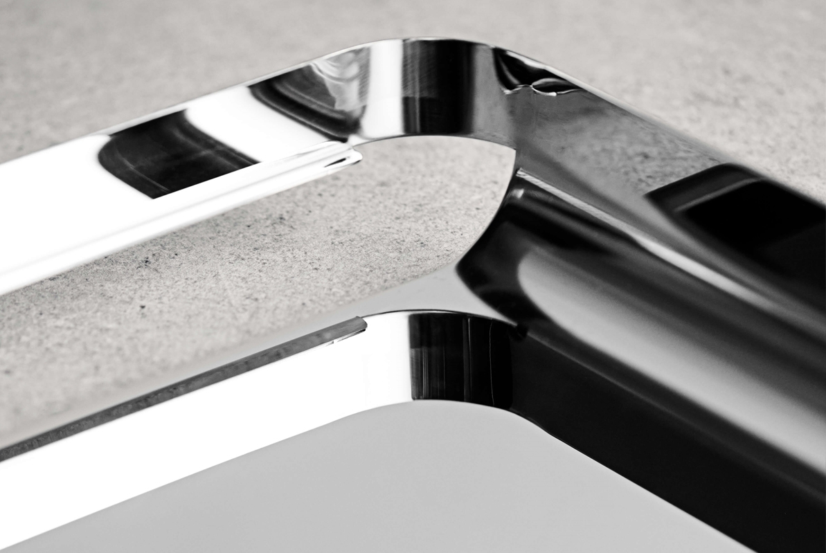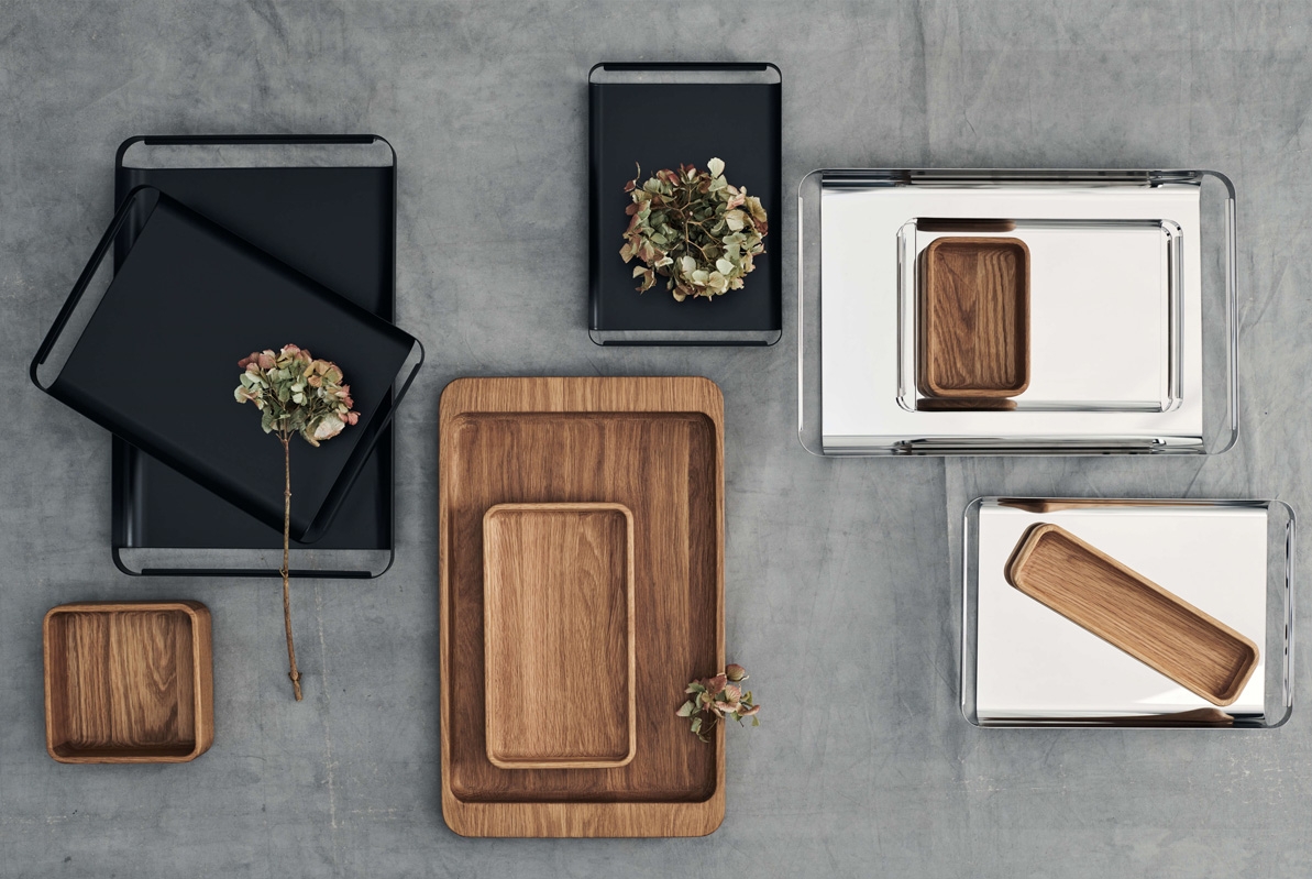 Unio is an elegant series of trays hand-formed in different finishes, each with its own distinctive appearance. The tray's elegant shape is made of only one piece of steel, making it a unique and distinctive design. The series comes in several sizes and is made of the highest quality. Each tray has a discreet cutout detail that doubles up as a handle and an aesthetic feature.