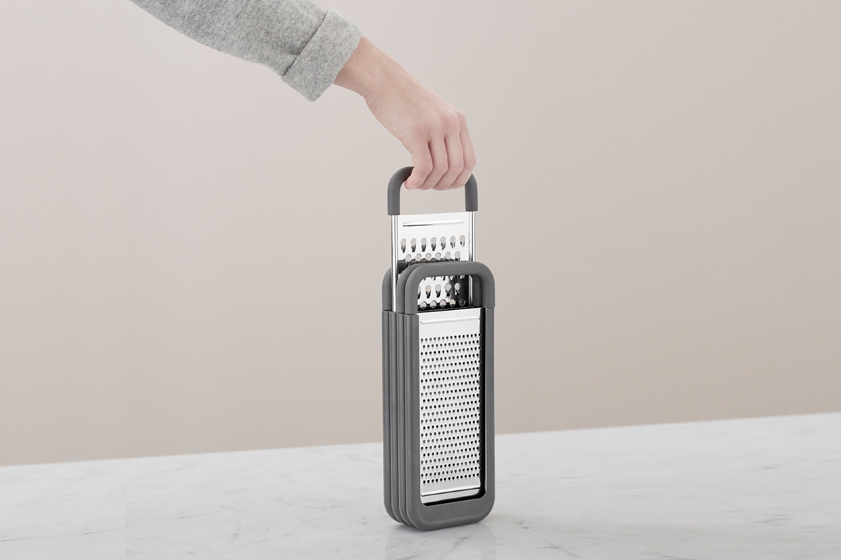 Grateful is sized just right, merging four different graters in one tool. With the collecting box placed just under the grating knife, allowing no waste at all. Equipped with non-slip grips on top and bottom. Easily stored and takes up a minimum of space in the cupboard or drawer.