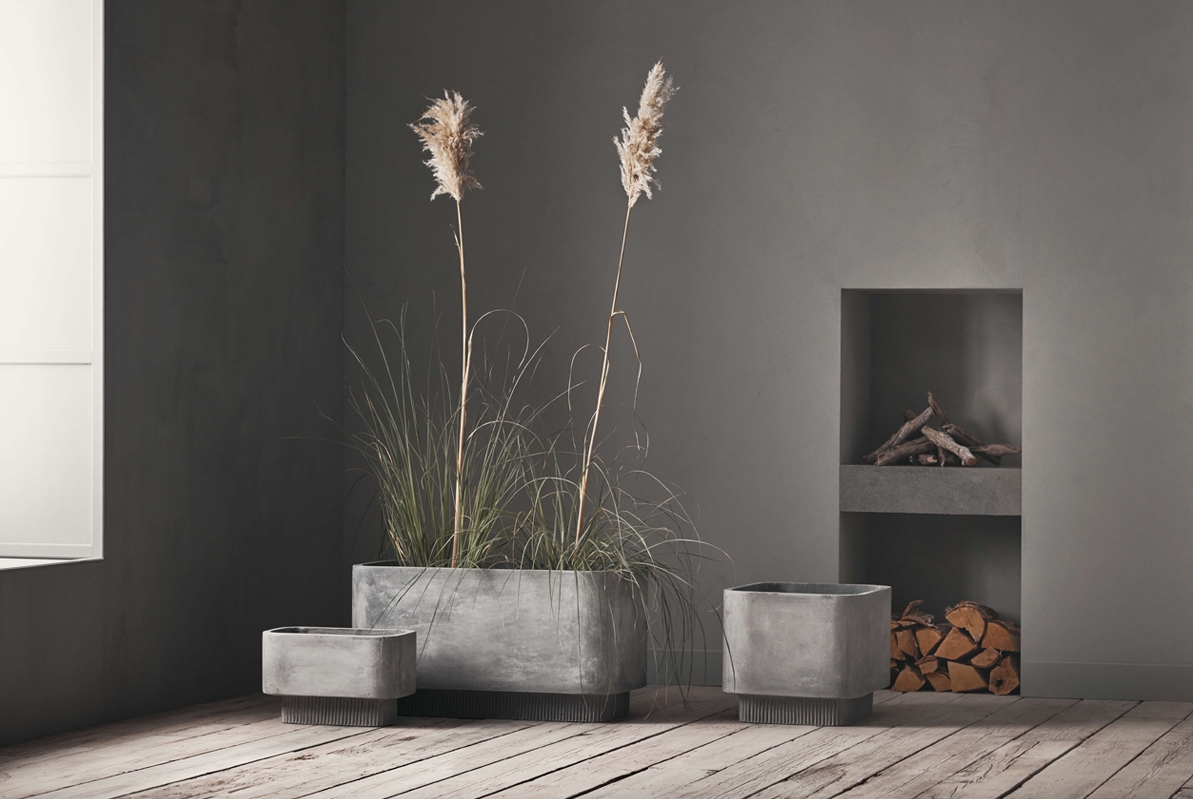 Highlands is a series of planters with a clear desire to create a green landscape inspired by architectural lines. The distinctive design language means the pots can be used as a room partition both inside and outside. The decorative base gives the planters an element of lightness. Highlands is made of colored fibre concrete and is naturally waterproof. They come in four different sizes and two tones - light and dark grey.