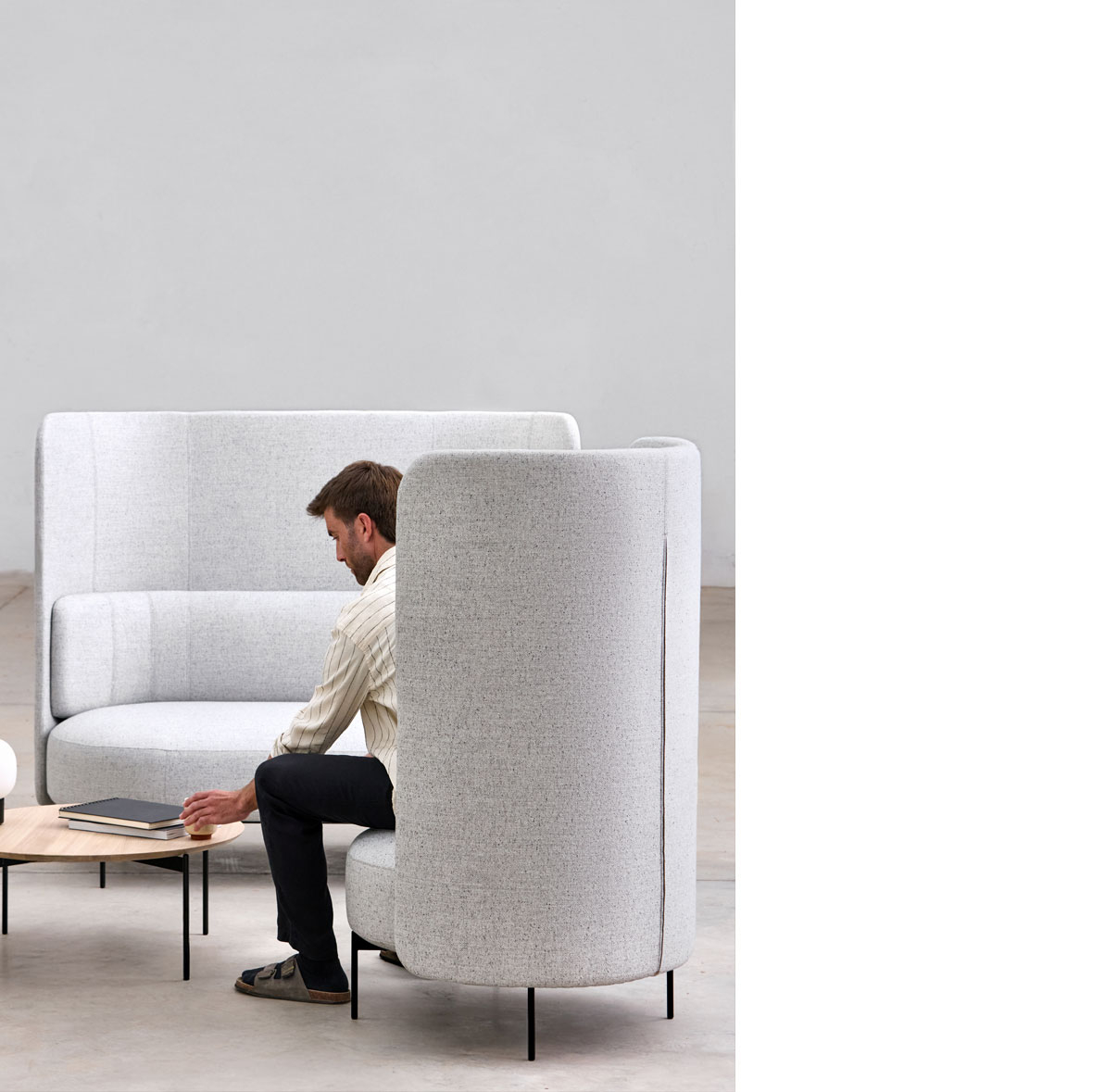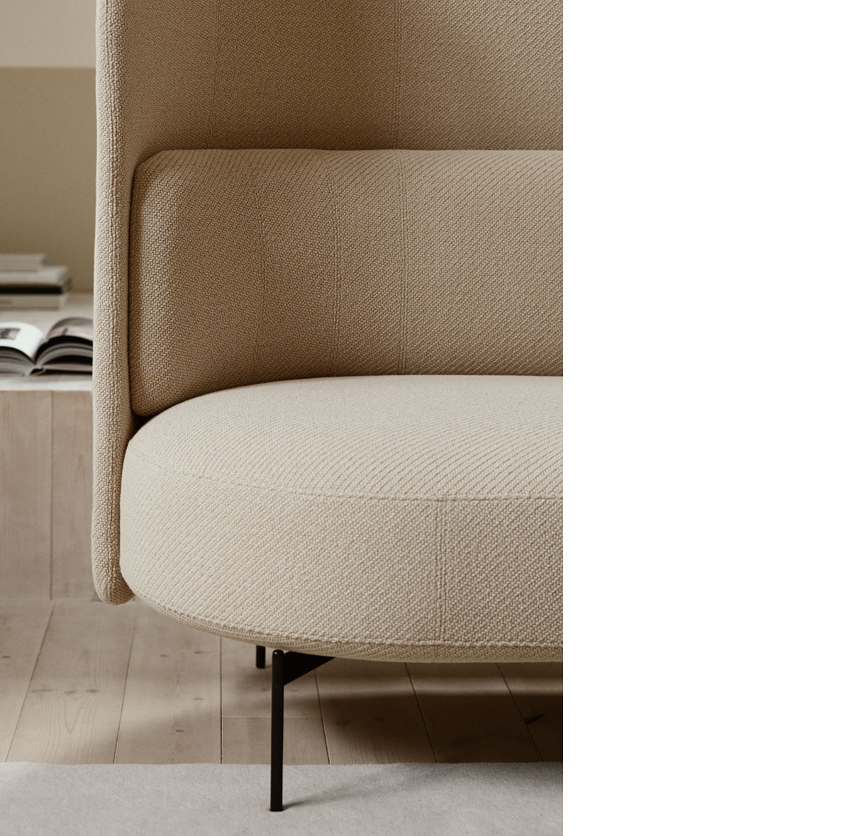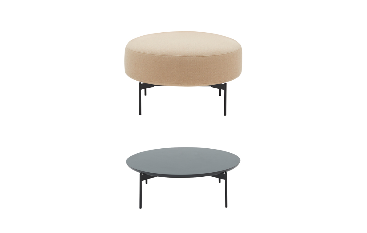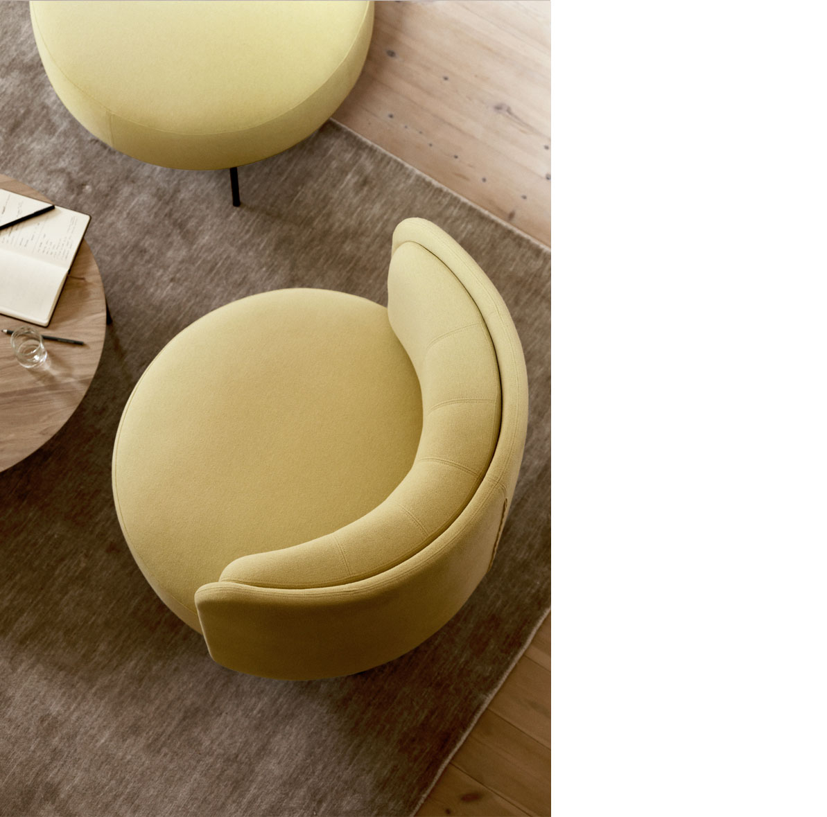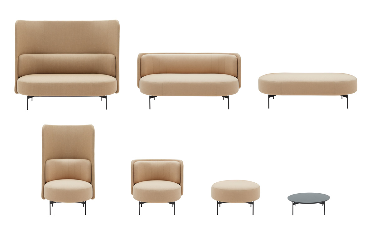 Joe is a series of soft, flexible seating furniture based on strong shapes, geometric curves, and clear lines. The centrepiece of the series is a circular pouf with slim legs. All seating elements are embraced by a light back wall that serves as a protective shell and creates comfort and privacy for relaxation or private conversations in hotel lobbies, lounge areas, libraries, or modern offices spaces. The soft backrest cushion provides maximum comfort. The family of seating poufs, sofas and armchairs are completed by a matching coffee table with the same floating appearance.