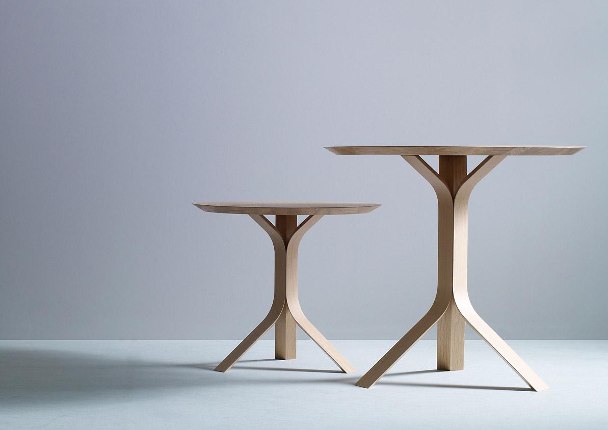 Namu is a table series consisting of a coffee table and a side table. The shape of the table is based on the appearance of a tree, and thereby refers to the material timber in a logical and honest way. The central base, the roots, are made of three identical laminated veneer elements which are joined mid-way to form a trunk. At the top the elements open up again to support the table top. The design of the Namu tables combines light appearance and high stability.