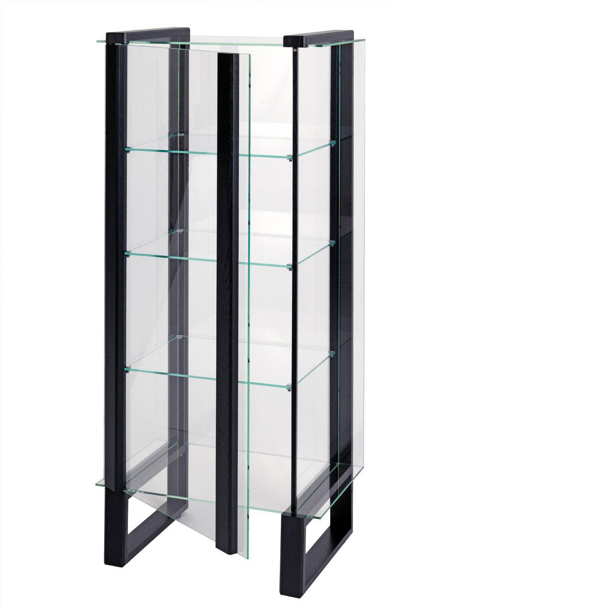 The Overseas Box glass showcase is a special place to display personal favourites from your collection and other treasures that deserve to be seen. Within a height of 146.8 centimeters, the adjustable glass shelves make it possible to vary the display most attractively. The front can be opened as a door. The solid wood frame is made from a strongly contrasting material: either brushed soft oak or oak with an open-pore paint finish, in which case there is a subtle range of colours to choose from. The shape was inspired by the trunks taken as luggage on a sea voyage in earlier times.