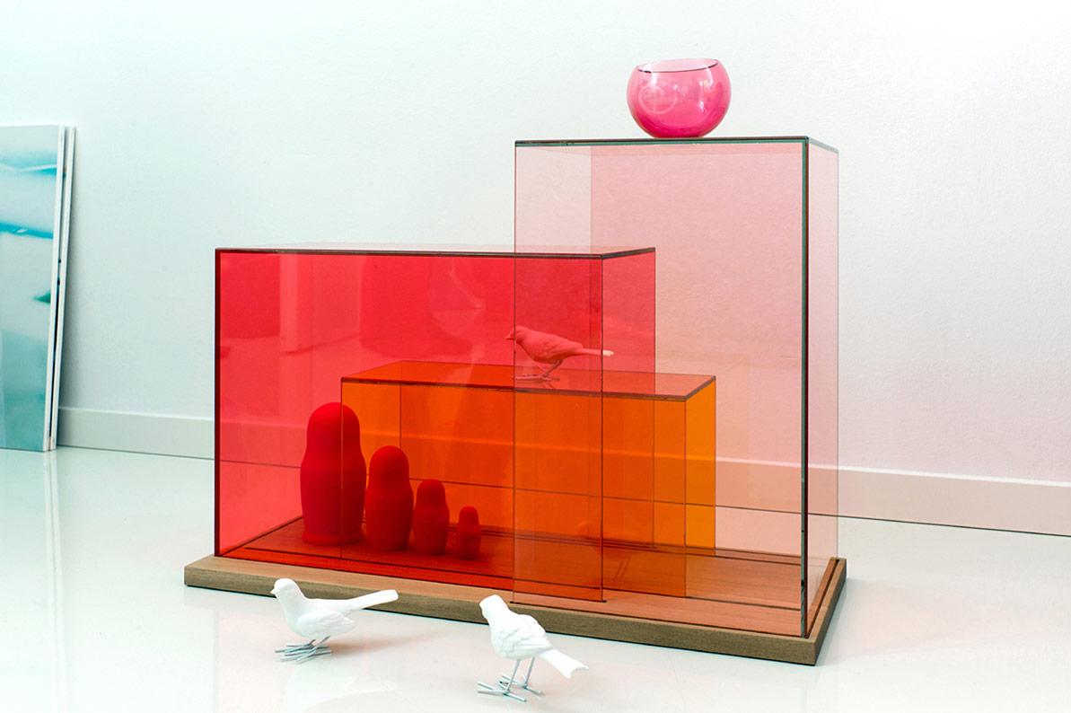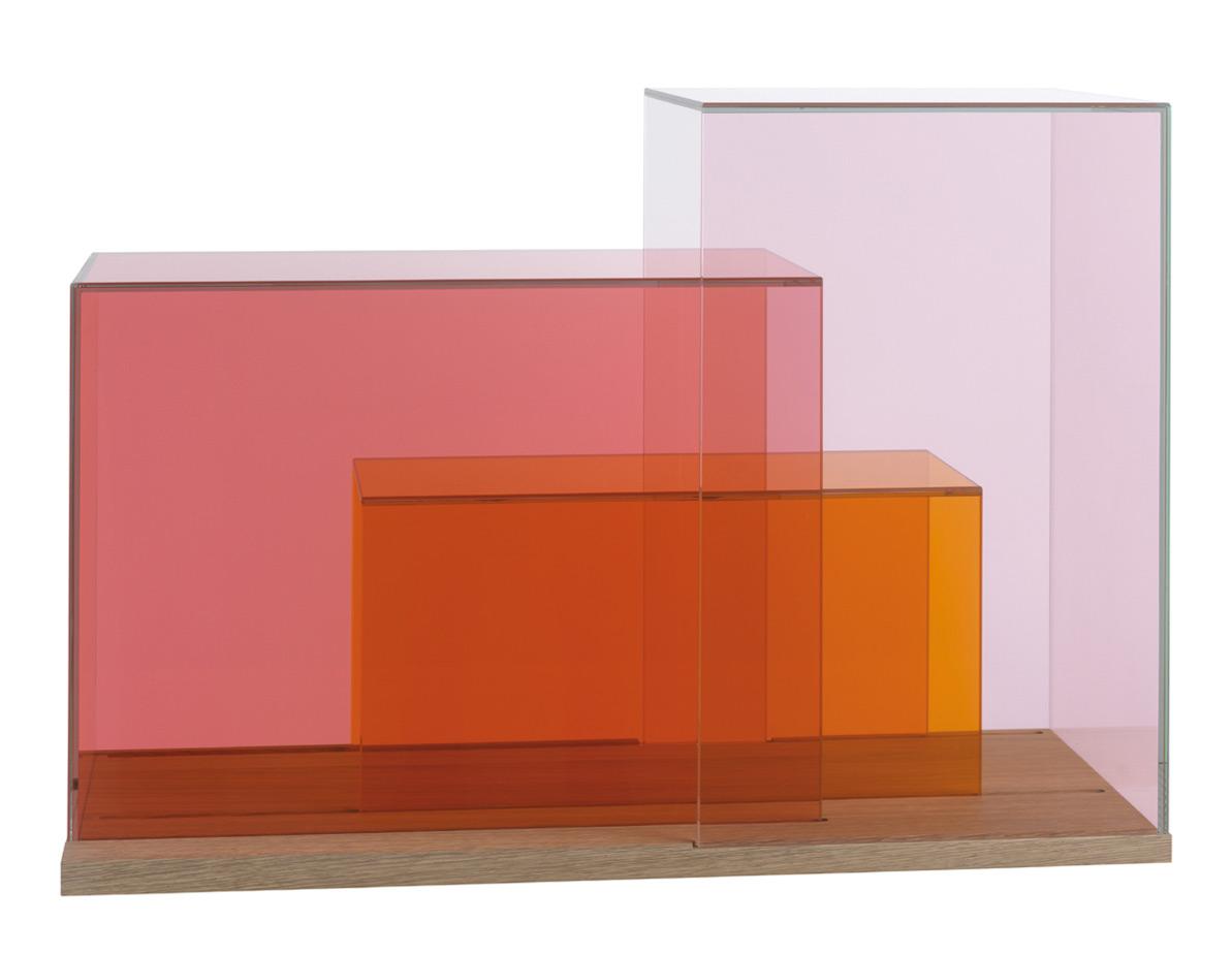 Glass cubes in three sizes and two sets: Set 1: coral rose, ruby red and tangerine. Set 2: smoke grey, ocean grey and aquamarine. Plinth: solid wood (brushed white oak). Dimensions (W/H/D) in cm: 47/64/26
