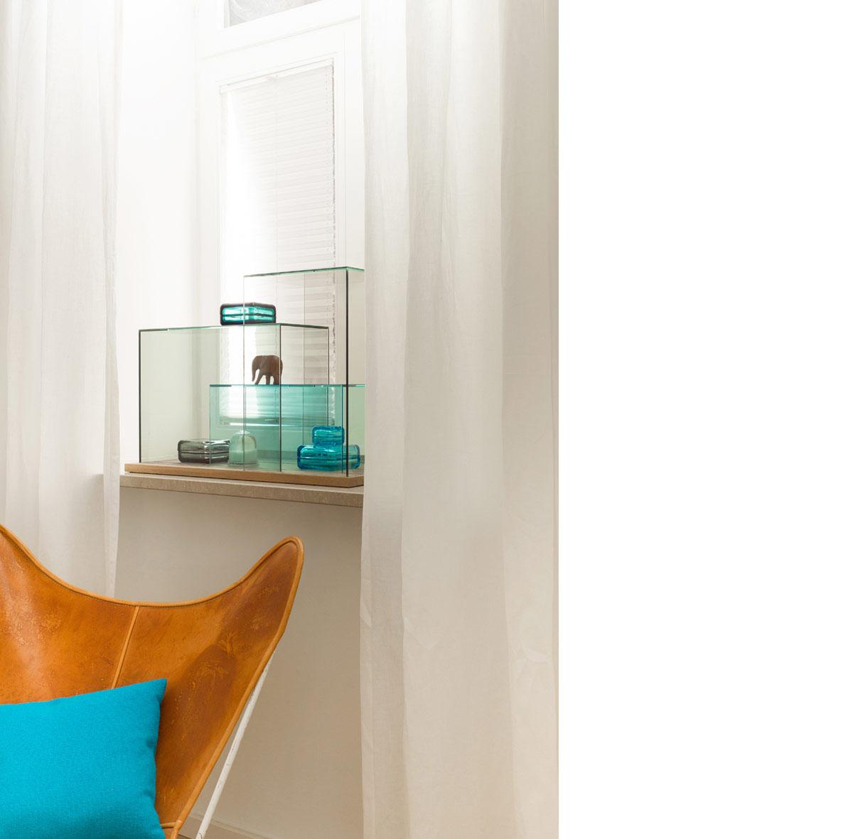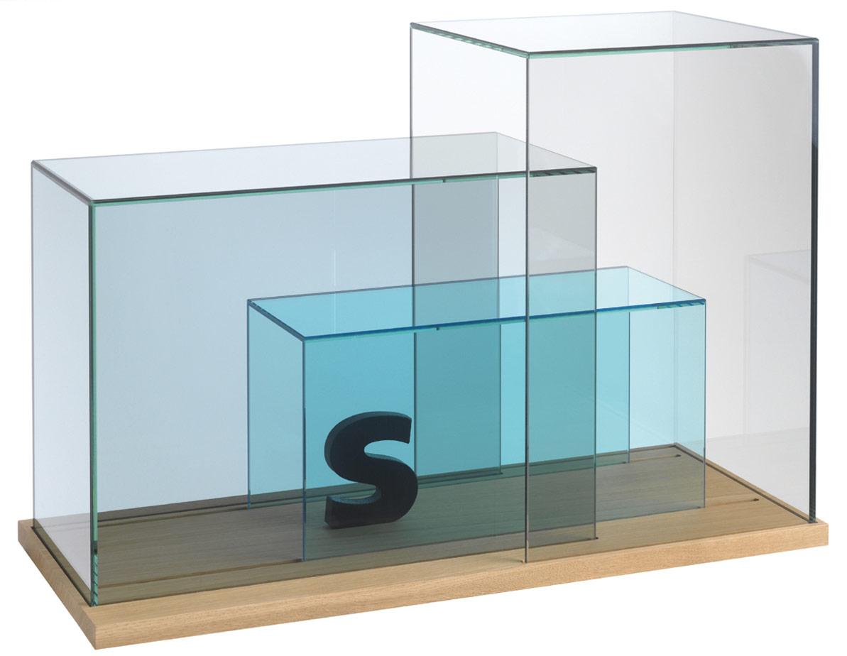 A subtle interplay of colour and transparency makes the Show Case ensemble a very special eye-catcher. In this interior accessory, favourite ornaments and items with special memories attached can be perfectly displayed. The 3 different cubes of flat glass in different colours are open at the side, and rest in grooves on a solid wood plinth of brushed white oak. They are detachable or can be slid to a new position. When they partially overlap, fascinating colour effects are created. This is an object that transforms every room into a private art gallery – and inspires you to change the exhibits whenever you prefer.